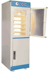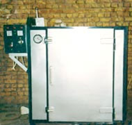 E8. Suitable for drying granules etc.The oven is double walled with insulation and is fitted with best quality 'U' type Escort heaters. A suitable blower driven by motor (Crompton) circulates the hot air. The fresh air can be drawn and most air can be exhausted by means of dampers provided. The temprature is controlled by a thermostet . The unit is supplied coplets with pannel box, having indicating lamps and tempreture indicators, starter, contractor etc, The unit is supplied without trollery & trays.